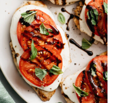 Grilled chicken topped with mozzarella, tomatoes, basil, and balsamic glaze.