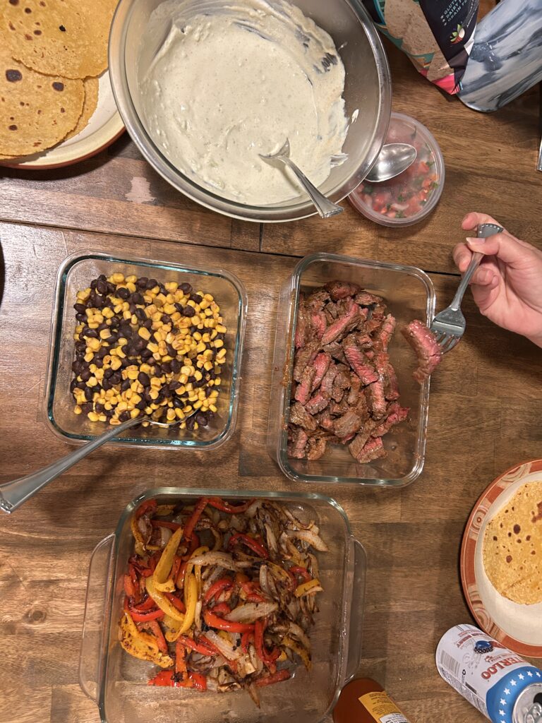 Baked chicken strips with bell peppers and onions in fajita seasoning.