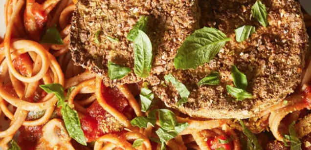 Crispy air-fried eggplant served over pasta with a veggie-rich marinara.