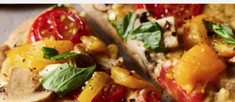 Whole wheat mini pizzas with a bean-based alfredo sauce and veggies.