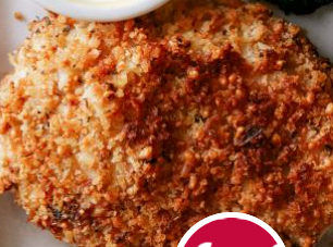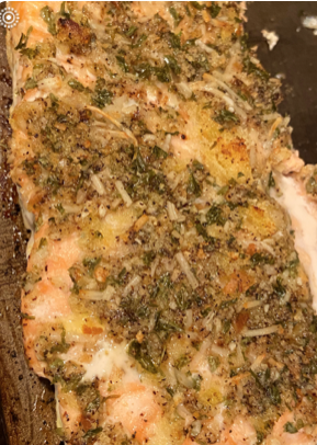 Baked salmon with a golden parmesan, garlic, and panko breadcrumb crust.