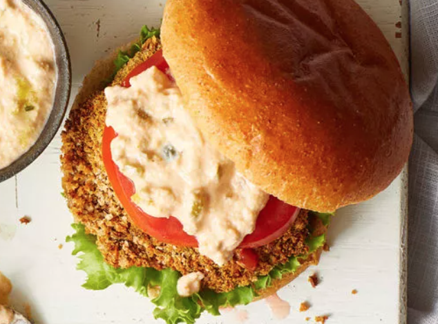 Panko-crusted portobello burgers with a creamy vegan thousand island sauce.