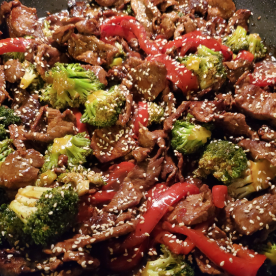 Sirloin steak and broccoli stir-fry in a savory garlic-soy sauce.