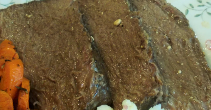 Savory beef roast slow-cooked with red wine, carrots, and onions.