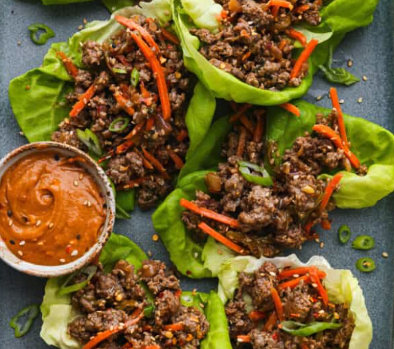 Lettuce leaves filled with seasoned beef and vegetables with peanut sauce.